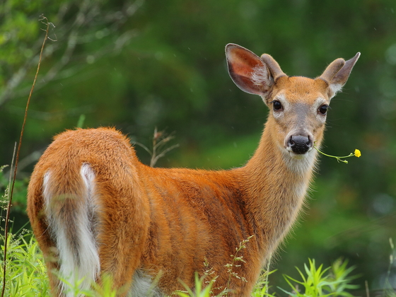 A white-tailed buck munching on buttercups in a summer rain shower.