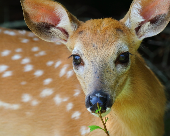 Close-up of a white-tailed deer fawn keeping a keen eye on me while curiously investigating a lone plant.