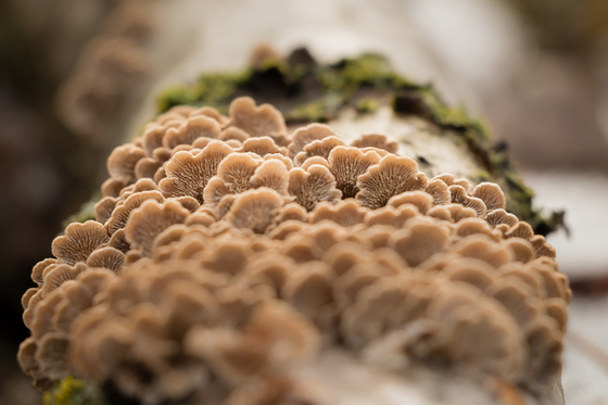 These tiny conks covered a tree branch that had fallen across a trail I was hiking on.
