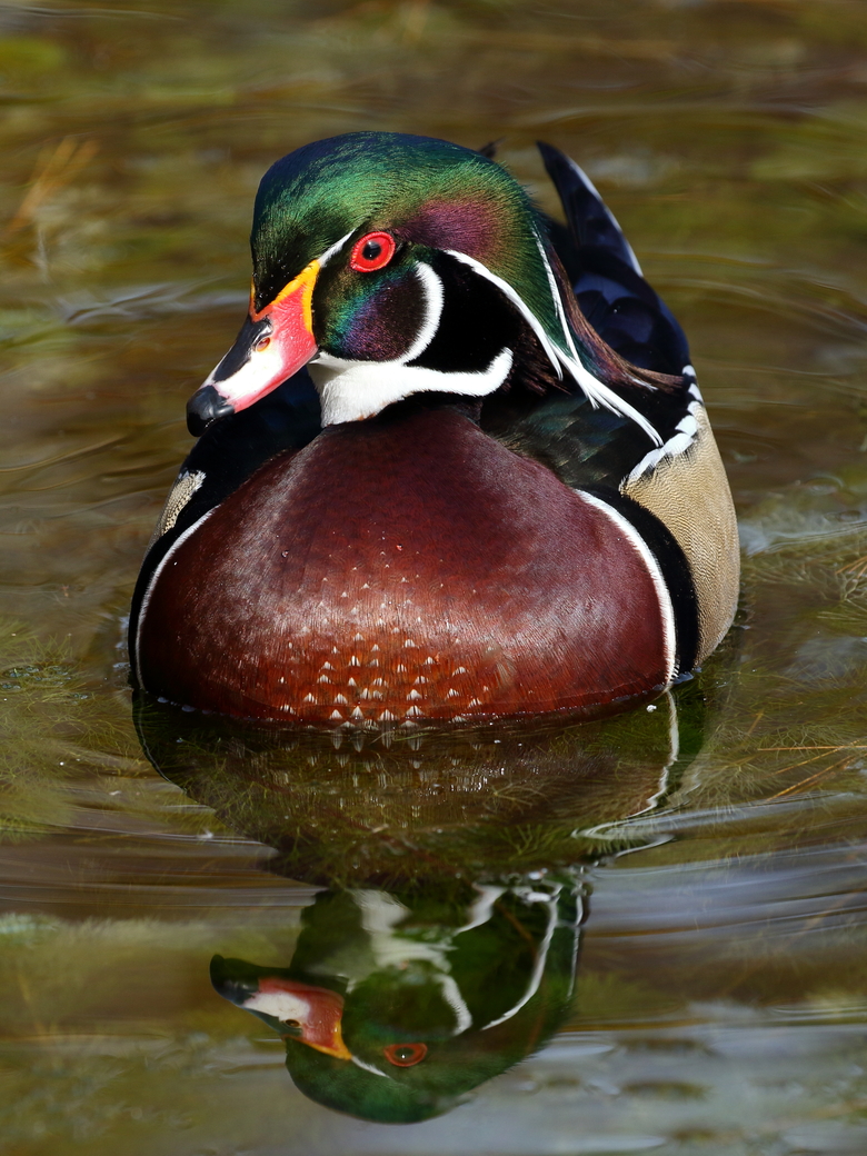 Close-up of a drake wood duck on the water with a beautiful reflection.