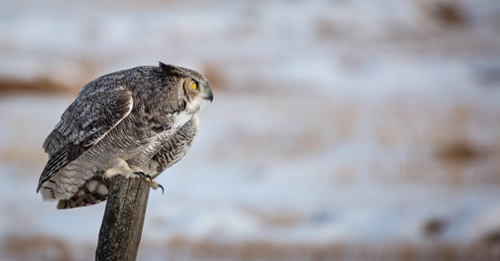 A great horned owl prepares for flight after spotting a meal off in the distance.