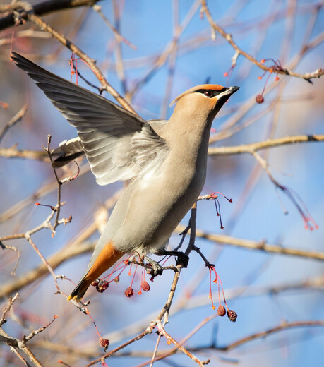 A bohemian waxwing spreads it's wings in soft winter light while hustling for berries.