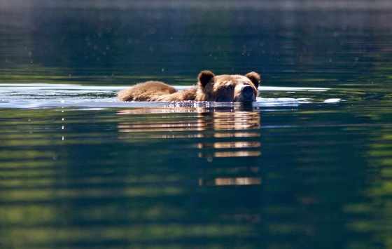 I was paddling on one of my favourite northern BC lakes when I noticed an animal engaged in a crossing. At first I thought it might be a moose but the shape wasn't quite right. As I got closer I could see that it was a grizzly. I tried not to get too close because I knew that it was feeling pretty vulnerable.