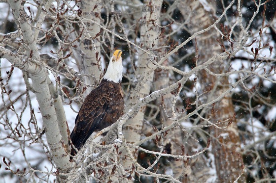 This Bald Eagle sits in a cottonwood next to the Elk river watching for a likely meal, on a cold winter morning.