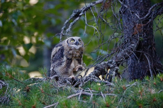 A fledged Great Horned Owlet waits for its parent to return with a testy snack.