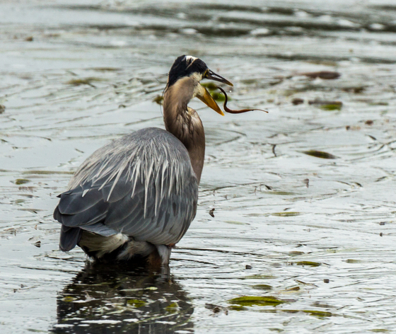 A great blue heron tosses an eel into the air before swallowing it.