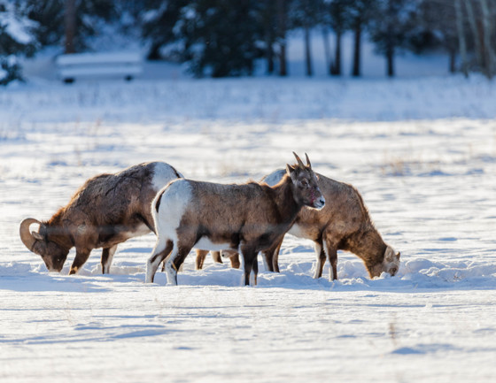 A herd of Mountain sheep was grazing along the David Thompson Highway in late December as we drove back close to sunset. It was amazing to watch the entire family enjoy digging through snow for some grass feed.