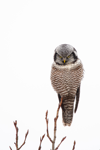 Owls have such a stern expression, however for this Northern Hawk owl it just adds to his incredible beauty