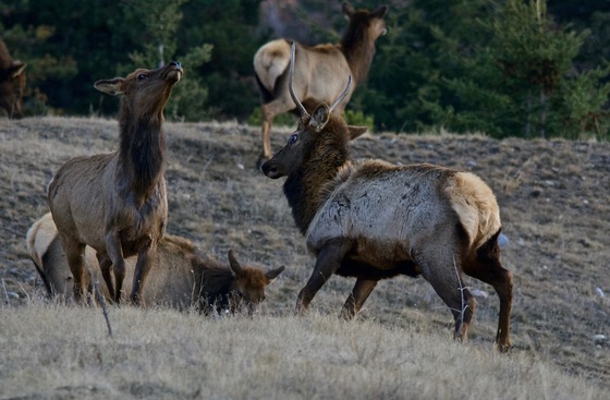 A juvenile bull elk has a good time playfully harassing some of the adult females.