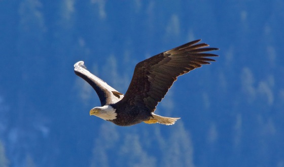 A mature bald eagle soars in the Skeena River Valley.