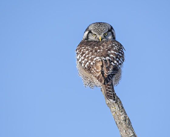 Reading about the baited and harassed Hawk Owl in Schomberg, Ontario, in the beginning of January, was upsetting. So, my husband and I decided to go out and find "our own" Hawk Owl. We went into Quebec and after a little while, we did find our own Hawk Owl, completely alone, without any other people around. It was great to see the owl performing naturally in its habitat. Exact location not disclosed due to the sensitivity of the species.