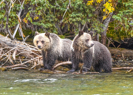 Twin Grizzly Cubs - about eight months old - waiting for Mom to catch a salmon for lunch