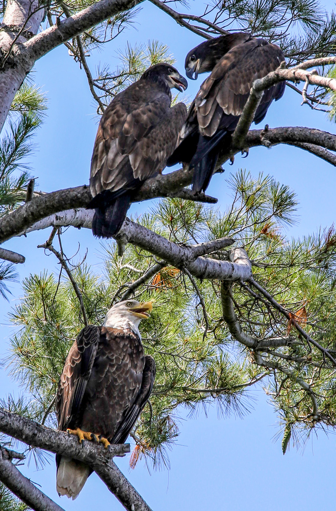 This mother bald eagle was resting in the summer sun with her 2 juvenile bald eagles. I was fortunate to observe them while travelling by in a boat.