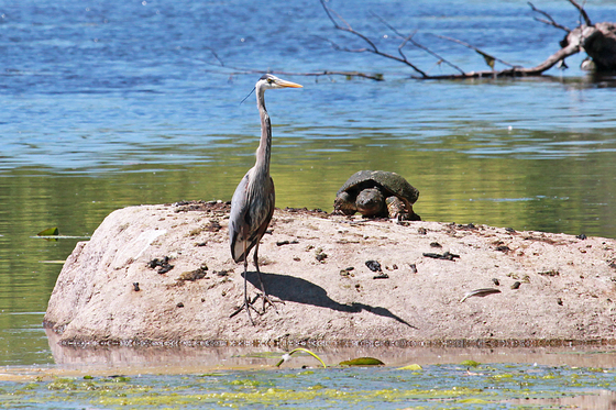 a great blue heron and snapping turtle share space on a rock at Mud Lake