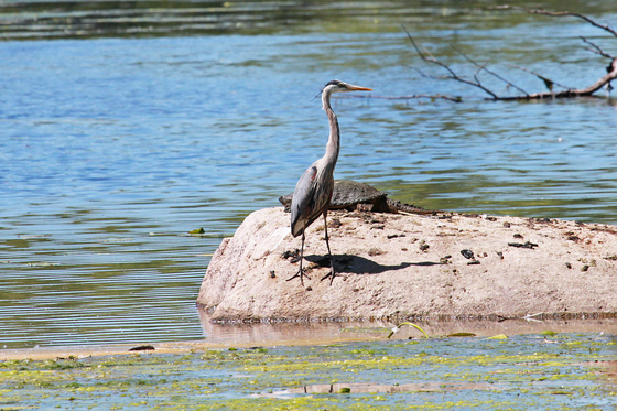 a great blue heron and snapping turtle share space on a rock at Mud Lake