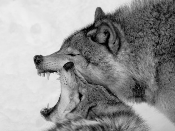 Grey wolves have a complex communication system. Here they are growling at one another to show who the dominate one is. I took it at such an angle so it looks as one jaw.