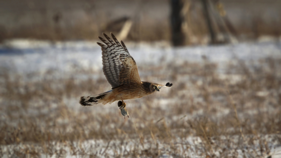 Northern harrier flying with her food in cold winter season...