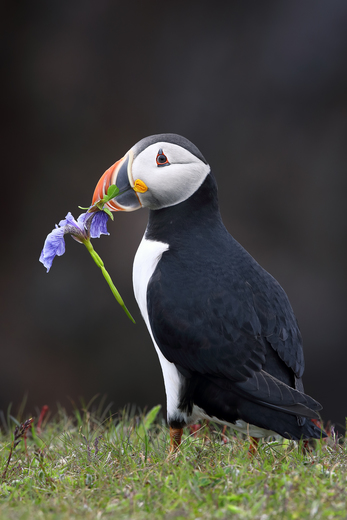 Atlantic Puffin holding an Iris plucked from the ground in Newfoundland, Canada.