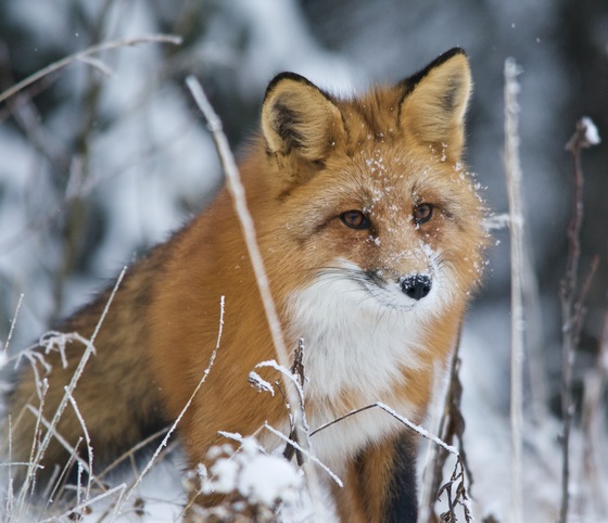 A red fox hunts, in some new snow, along highway 37 north, BC.