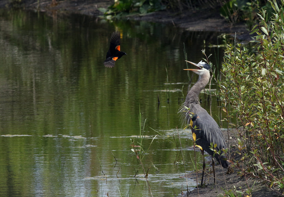 The Red-winged Blackburn kept dive bombing the Great Blue Heron in hopes of scaring it away from the nest.
