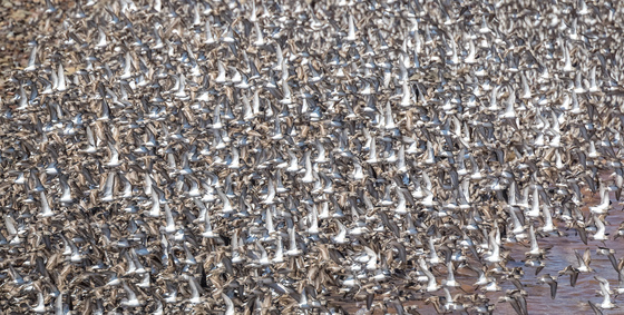 The Bay of Fundy is a stopover for thousands of migrating shorebirds (mostly Sandpipers). They land and take off in large groups and often create beautiful patterns in the air.
