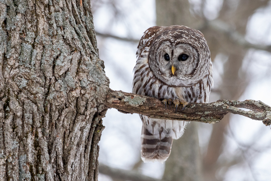 This Barred Owl was actively hunting, it kept looking around and on the ground, after a few minutes of observing it dived down and caught a vole and flew away to another tree with its catch. I watched from a distance as he carefully mantled his prey looking around for other birds who might try and swipe his food, then a with quick couple of gulps it was gone.