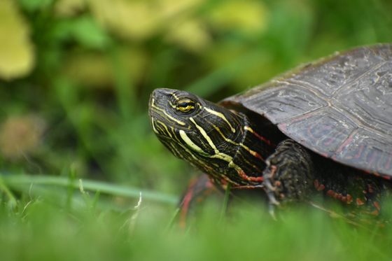 This turtle was crossing a lawn and I kept low to get some blur of the grass while keeping focus on the turtle's head