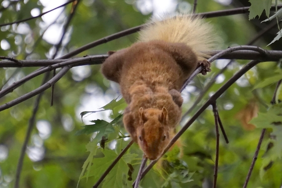 A rare white-tailed squirrel suddenly notices the photographer and spins around to investigate.