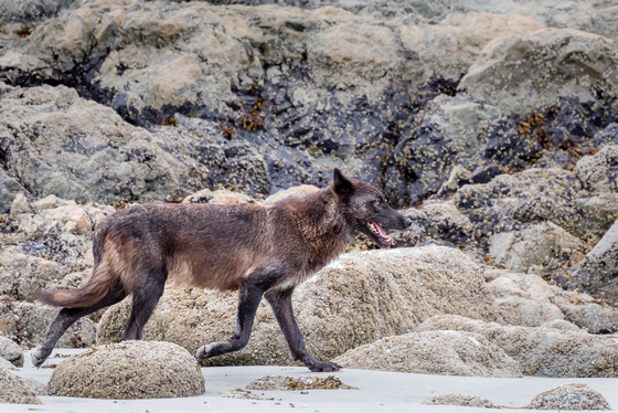 BC Coastal Wolf travelling the shoreline at low tide.