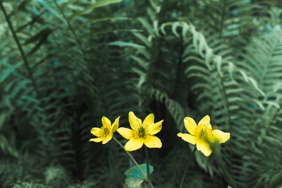 Some marsh marigolds stand out in the green ferns of a marsh in norther Saskatchewan
