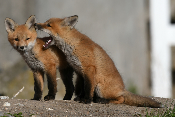 Red fox kits playing.I took this shot as I was observing 6 fox kits playing.The kit was yawning as I snapped this shot.