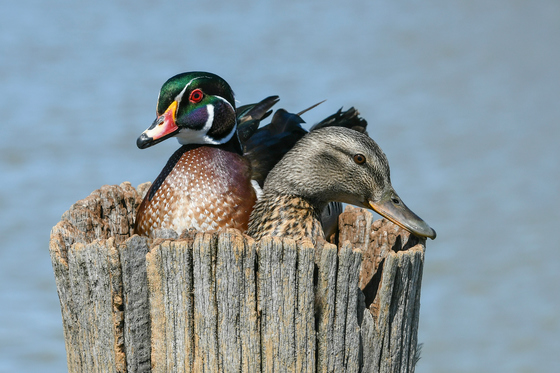 I took this shot of a drake wood duck with his hen mallard girlfriend.They were sitting together on their clutch of eggs when I took this shot.