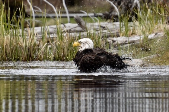 A bald eagle splashing and preening