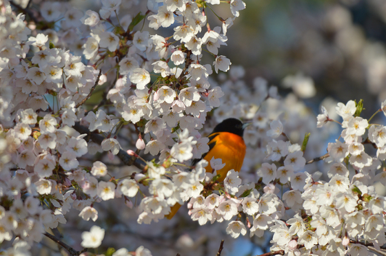 This Baltimore oriole was seen snacking on Cherry Blossoms in High Park, Toronto.