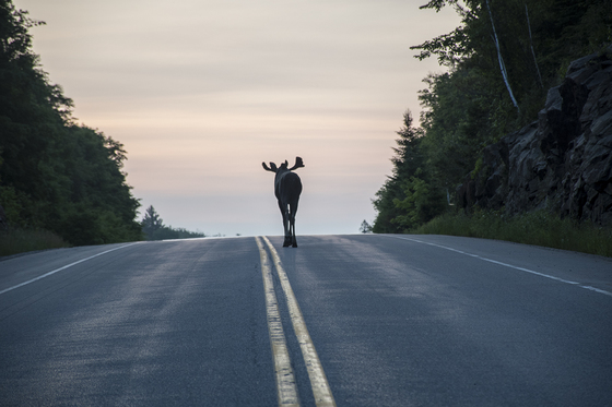 During an early morning drive on Highway 60 in Algonquin Park, we came across this bull moose in the middle of the road. We felt we were at the right place at the right time to capture him walking towards the crest of the hill against the glowing morning sky.