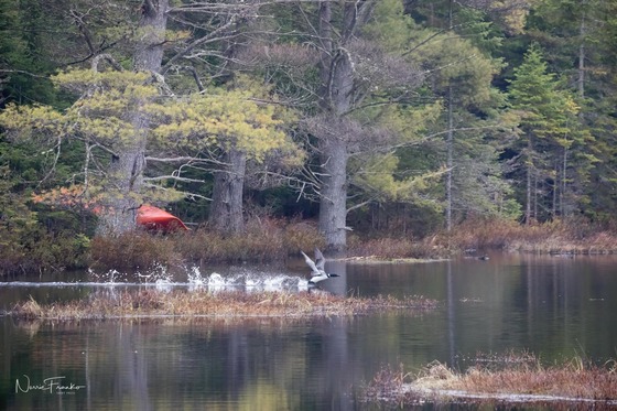 You just never know what to expect when you are waiting for wildlife. Waiting for a moose that never arrived I was entertained by this loon. It swam around a small point out of sight for a bit. I heard the start of the take off before I saw it. The sound is unmistakable. I was lucky enough to capture some of take off before the loon was gone.