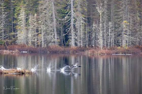You just never know what to expect when you are waiting for wildlife. Waiting for a moose that never arrived I was entertained by this loon. It swam around a small point out of sight for a bit. I heard the start of the take off before I saw it. The sound is unmistakable. I was lucky enough to capture some of take off before the loon was gone.