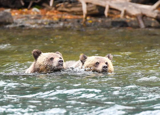 Twin Grizzly Cubs try to keep up with their Mom who is ahead of them looking for spawning salmon.