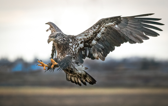 A juvenile bald eagle, talons spread, coming in for a landing.