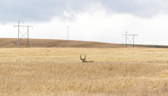 A large whitetail buck sticks out from the wheat field in which he's feeding.