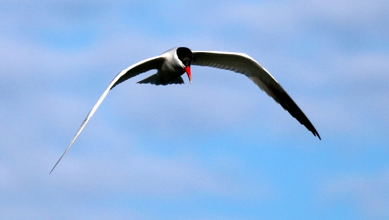 A Caspian Tern circles over a pond searching for fish.