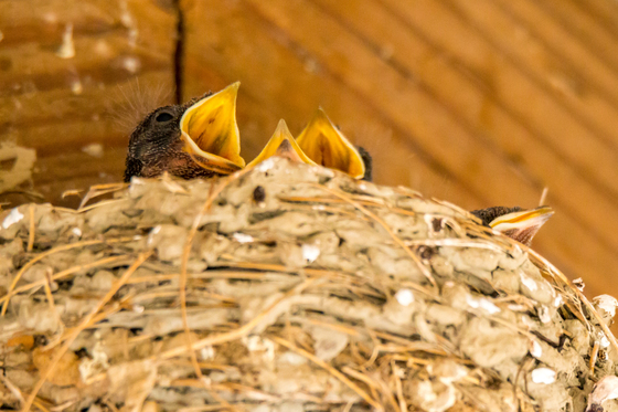 Four barn swallow babies chirping for food.