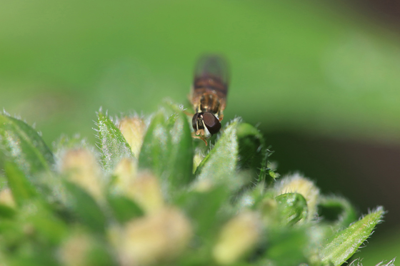Macrophotography of a Syrphid fly on a green plant