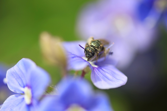 Macrophotography of a little flying insect on a little flower
