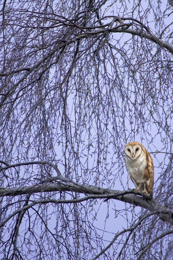 beautiful barn owl takes rest in the trees as the sun sets in the background