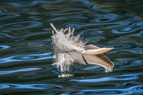I was photographing reflections when I noticed the feather floating by and captured it before it disappeared. The feather came from some mallards that were playing in the water and seemed to be having a bath time party