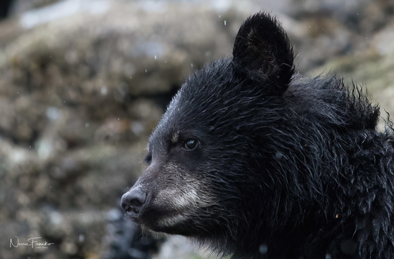 Rain falling, zodiac rising and falling with the waves I managed to capture this portrait of the little bear cub I named Hope . He looked out over the channel, his pale muzzle, so very different in colour from the warm honey muzzles of the black bears of Algonquin. This difference giving me hope that he will pass on the Kermode gene.
