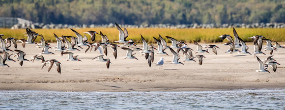 This is part of a large group of Black Skimmers that were blown onto our shores by Hurricane Dorian. This particular day they had settled in an area of a cove where the tides varied throughout the day. At low tide they would skim for food. They were quite far away separated from me by a body of water. I got this shot when an eagle flew overhead and startled them and they took off and flew around for a bit before settling back down on the sand.