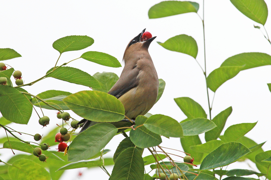 a cedar waxwing with a mouth full of berry in my backyard tree