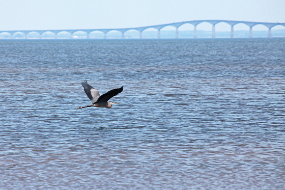 a great blue heron flies toward the Confederation Bridge in NB